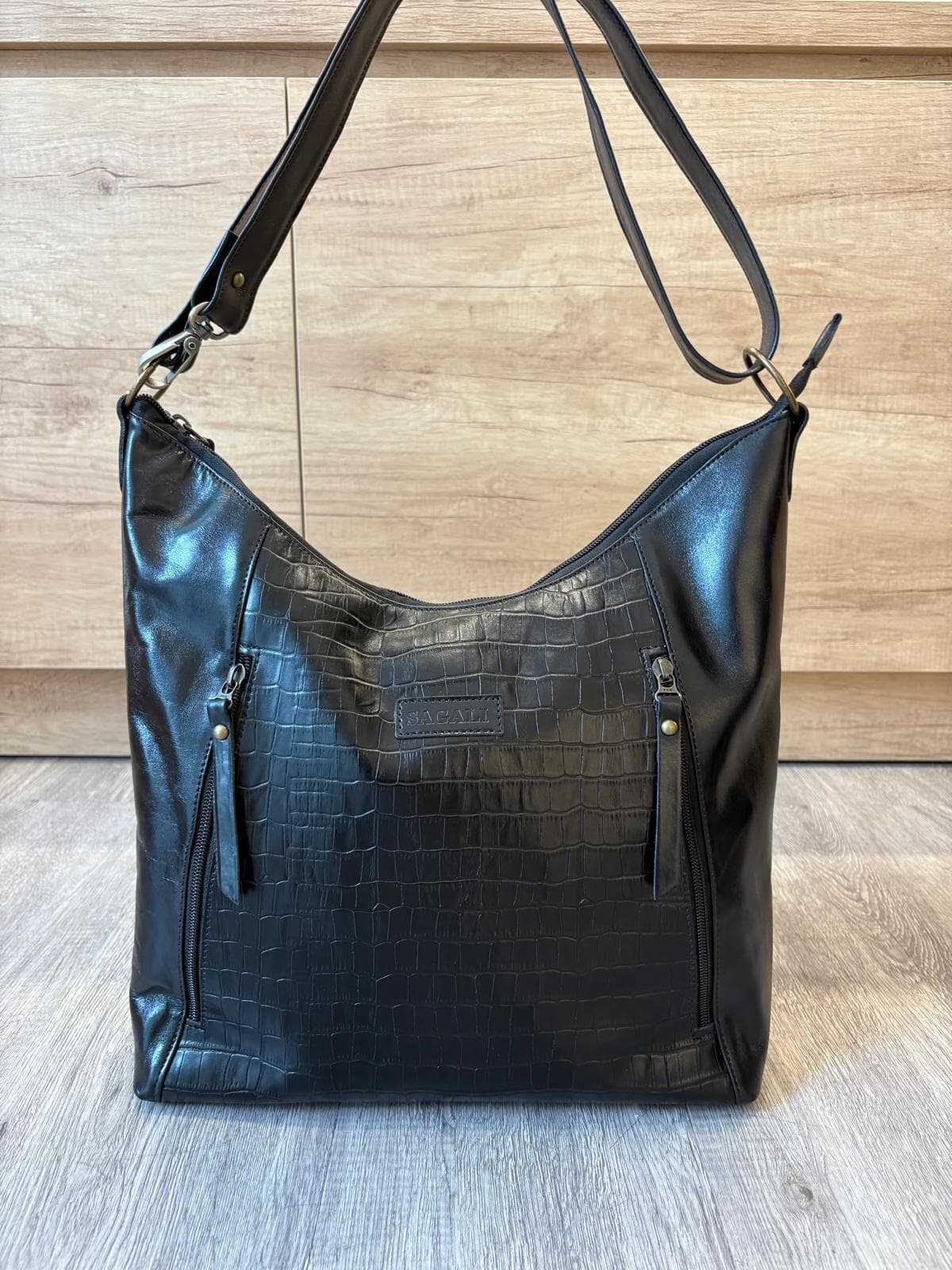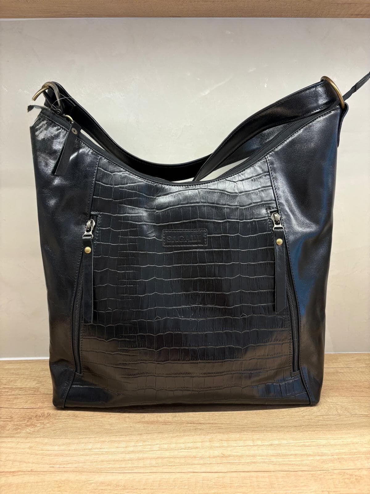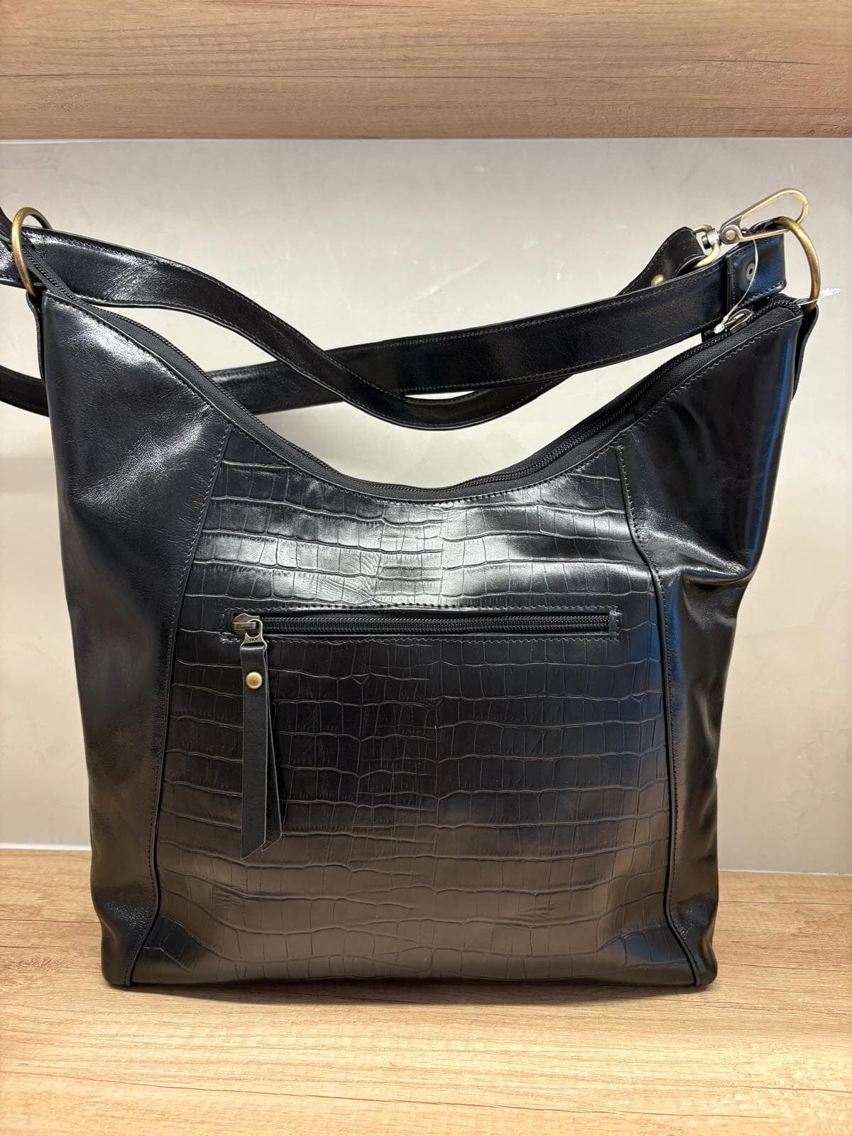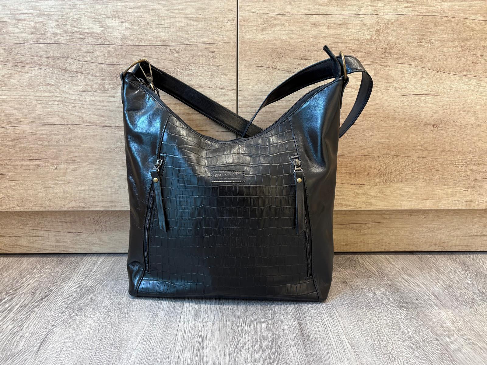Espacioso y con carácter: este bolso shopper de cuero es ideal para el día a día. Combina un diseño hobo de gran capacidad con una mezcla de texturas, destacando el panel frontal en relieve efecto croco brillante. Cuenta con múltiples bolsillos externos con cierre para una organización óptima y un estilo sofisticado. La correa ancha y ajustable permite llevarlo cómodamente al hombro o cruzado.